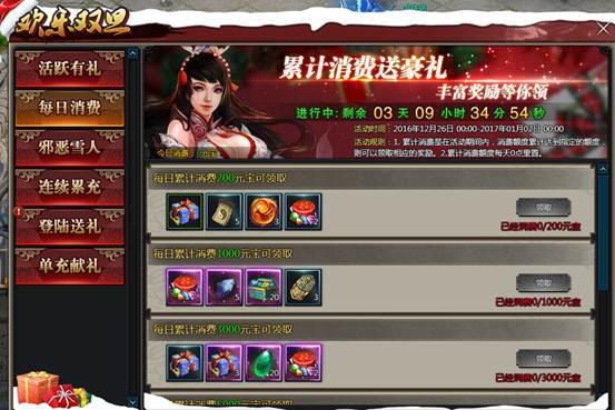 活动期间,玩家每日消费不同档次元宝可领取对应奖励