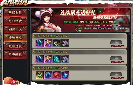 活动期间,玩家连续充值天数与元宝额度达到对应要求,即可领取奖励