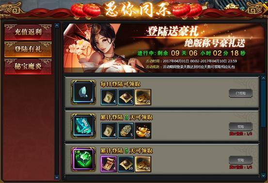 2.活动时间内,玩家在对应时段登陆游戏即可获得丰富奖励。