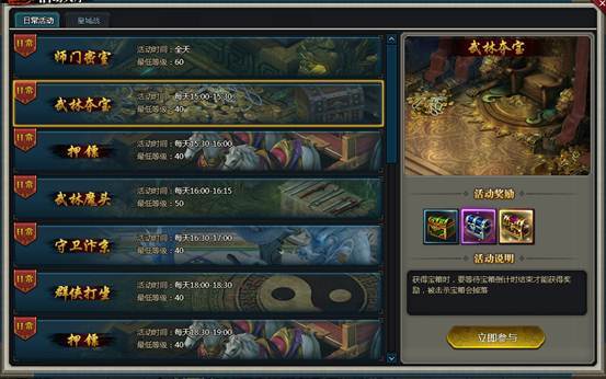 每天开启两次武林夺宝活动,下午15:00-150:30,晚上20:30-21:00,40级以上的玩家可进入。