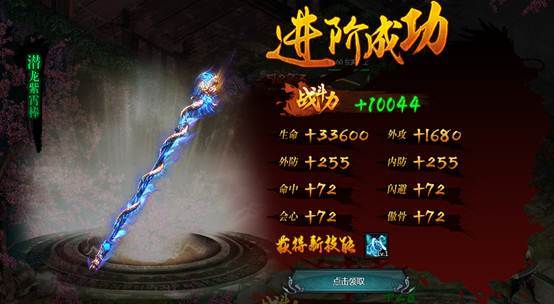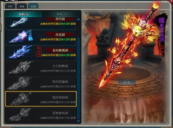 (4)成功进阶到下一阶,可获得下一阶的神兵形象,游戏默认会自动切换最高一阶的形象,可以通过神兵中幻化页面,选择幻化低阶的神兵;选择幻化后,自动幻化为玩家选择的神兵,上下线不会改变选择,下次进阶成功,会自动切换为最高一阶神兵形象;