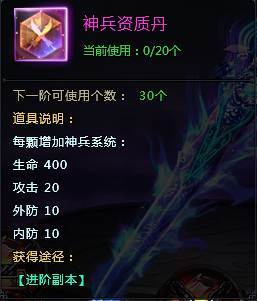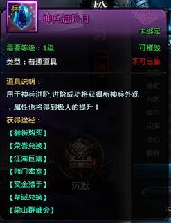 (2)神兵进阶丹允许使用元宝以及绑元在御街进行购买,并且可使用荣誉兑换,参加江湖巨寇等活动获得。