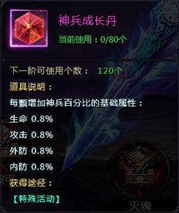 神兵达到3阶后,将可以喂食成长丹或资质丹,成长丹可以百分比增加神兵的进阶属性;神兵的阶数越高,可喂食的成长丹颗资质丹数越多,同样每颗资质丹增加的属性