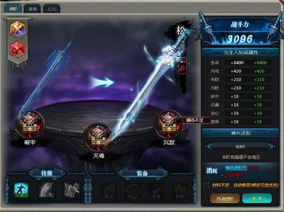 (1) 神兵进阶需消耗神兵进阶丹、铜币进阶;