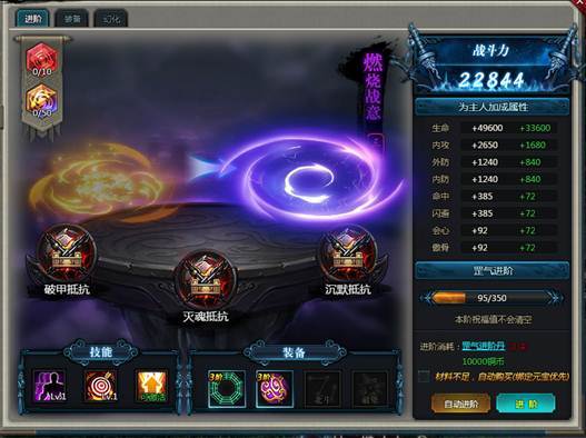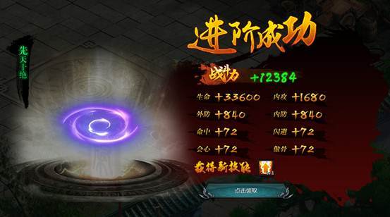 (3)鼠标移动至“进阶”按钮时,左侧显示玩家当前阶数的罡气形象,右侧进阶界面显示玩家下一阶罡气形象,并且属性会出现下一阶的属性加成哦。