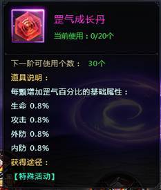罡气达到3阶后,将可以喂食成长丹或资质丹,成长丹可以百分比增加罡气的进阶属性;罡气的阶数越高,可喂食的成长丹颗资质丹数越多,同样每颗资质丹增加的属性越多;