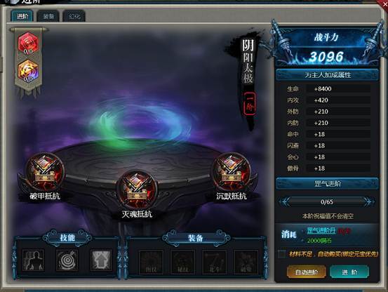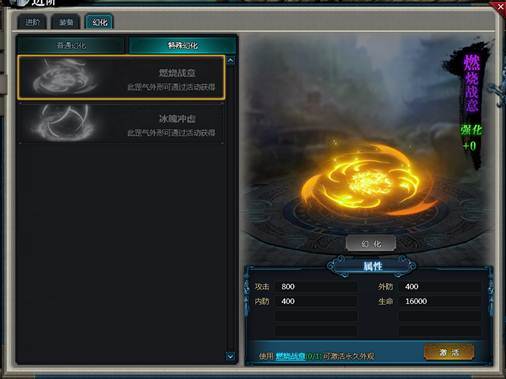 (4)成功进阶到下一阶,可获得下一阶的罡气形象,游戏默认会自动切换最高一阶的形象,可以通过罡气中幻化页面,选择幻化低阶的罡气;选择幻化后,自动幻化为玩家选择的罡气,上下线不会改变选择,下次进阶成功,会自动切换为最高一阶罡气形象;