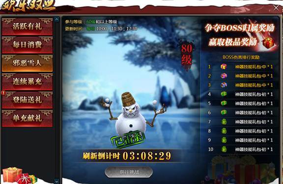 活动期间内,每日10点、11点30分、17点30分邪恶雪人将来捣乱,请各位玩家提前做好准备,抗击雪人。