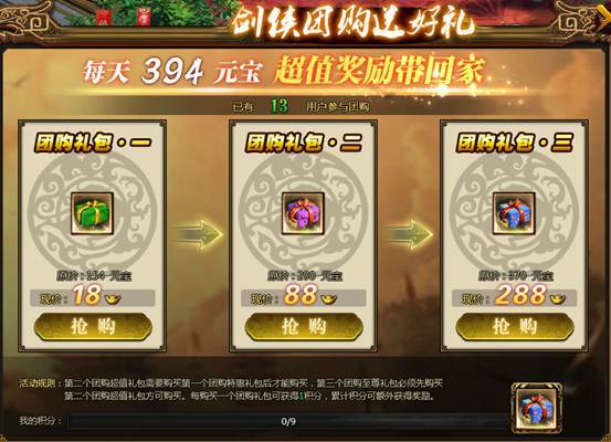 2.活动内容:活动时间内,每天可购买三种团购礼包,购买后获得积分可获得额外奖励。