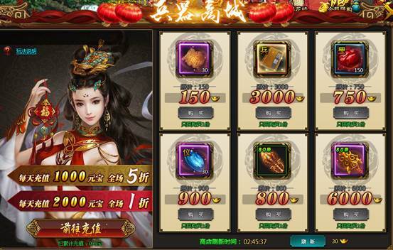 2.活动内容:活动期间玩家充值相应金额以上,商城内道具分别可打1折或5折。