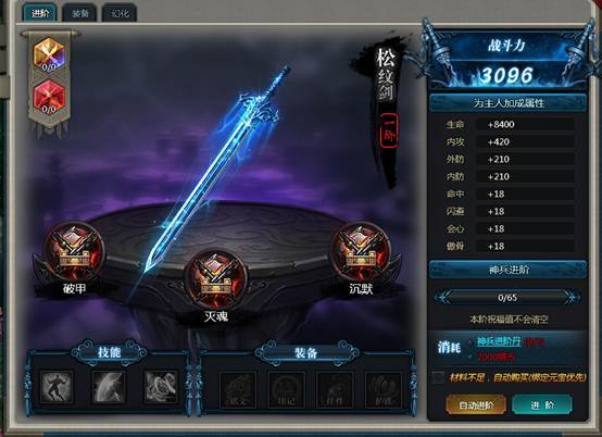 (4)神兵的技能可以通过使用神兵技能升级书来进行升级,升级过后的技能增加更高的人物角色属性;
