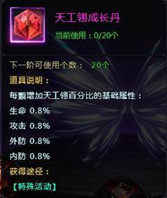 翅膀达到3阶后,将可以喂食成长丹或资质丹,成长丹可以百分比增加翅膀的进阶属性;翅膀的阶数越高,可喂食的成长丹颗资质丹数越多,同样每颗资质丹增加的属性越多;