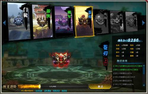 (3) 升级方式:通过击杀玩家、武林通缉、团竞活动和竞技场获得侠义升阶经验;当前阶数侠义值达到上限,玩家可对系统进行升阶,需要手动激活;